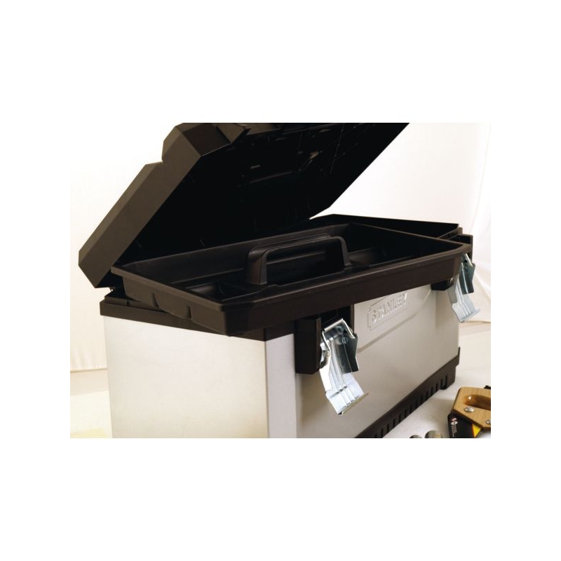 Ossature métallique et polypropylène. Larges attaches métalliques. Plateau porte-outils 3/4 intégré. Rainure en V sur le couvercle pour découpe d'appoint. Cadenassable. Livrée sans outils.