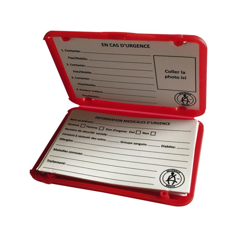 Facile à clipser à la ceinture ou au harnais, ce boîtier plastique contient les informations médicales et la photo du porteur. Composé de : - 1 boîtier - 2 lots de cartes d’information à compléter manuellement - 1 autocollant de parebrise.
