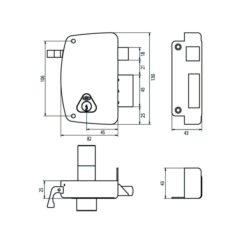 À cylindre laiton. Pêne ½ tour en laiton. Équerre au ½ tour pour manœuvre extérieure. Coffre et gâche acier embouti. Pênes laiton massif. Protection anticorrosion. Livré avec gâche et 3 clés. Course du pêne dormant : 21 mm Finition : époxy noir Modèles horizontaux : Dimensions (LxHxP) : 143 x 99 x 25 mm Entraxe : 60 mm Fouillot carré : 6 mm Modèles verticaux : Dimensions (LxHxP) : 82 x 130 x 25 mm Entraxe : 70 mm Fouillot carré : 7 mm Conditionnement : boite