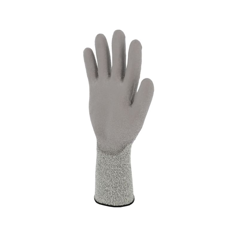 Enduction polyuréthane souple sur la paume. Support tricoté en fibres haute ténacité HDPE (polyéthylène haute densité PEHD), sans couture, jauge 13. Dos aéré, poignet élastique long avec renfort. Renfort entre le pouce et l'index. Risque coupure D Manutention légère / Milieu sec Applications métiers : manutention de tôles coupantes, fabrication de tôles, assemblage automobile, maintenance industrielle, prise de câbles, d'objets coupants, manipulations de matériaux bruts, abrasifs, de carrelages, de céramiques Taille : 8 à 11 Norme : CE Cat II - EN 388 (4X43D)