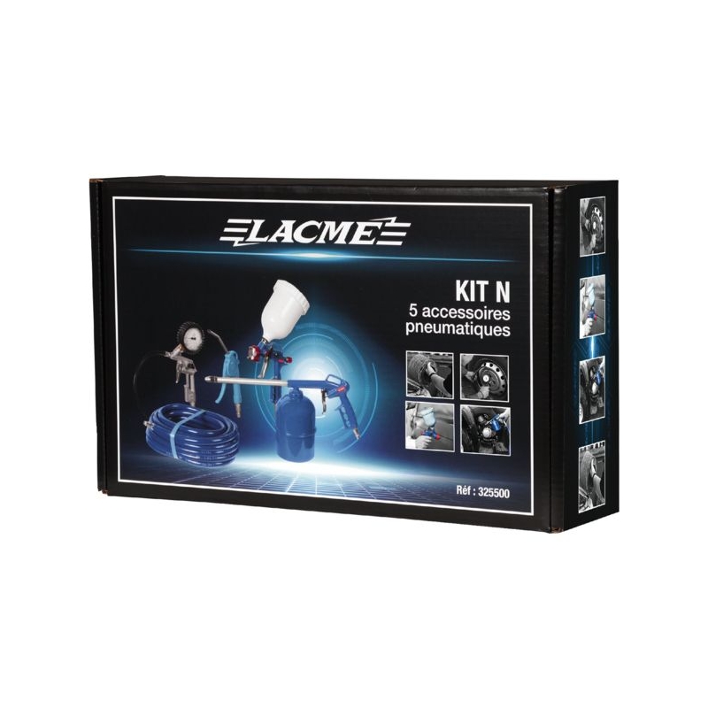 Composé de : - 1 soufflette progressive bec long 110 mm, - 1 pistolet de gonflage 0-10 bar, - 1 pistolet de peinture à gravité (godet 0,6 l, buse 1,5 mm), - 1 pulvérisateur (godet 1 l, tube 250 mm), - 1 tuyau armé Ø 8 x 14 mm x 8 m.