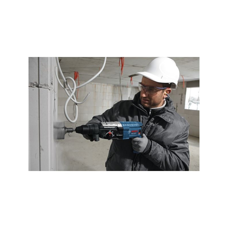 Orientation de l'outil, embrayage de sécurité, stop de rotation, stop de frappe et mandrin interchangeable. Emmanchement : SDS-Plus Puissance : 880 W Puissance de frappe : 3,2 J Vitesse : 900 tr/mn Cadence de frappe : 4000 cps/mn Taux de vibrations : 11 m/s² Poids : 3,100 kg Livré en coffret L-Case avec poignée supplémentaire, mandrin Quick-Change, mandrin interchangeable SDS-Plus, jauge de profondeur.