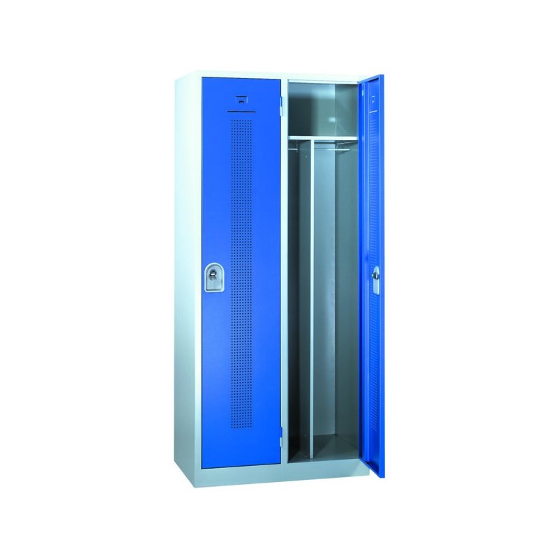 Porte renforcée par un raidisseur vertical, aérations. Porte-étiquettes, tringles portes cintres avec crochets, fente courrier et fermeture encastrée par moraillon débrayable porte-cadenas (serrure à clé en option). Hauteur sur socle : 1800 mm Profondeur : 500 mm Coloris : corps gris, porte bleue Option disponible : pieds emboitables en acier ou en inox
