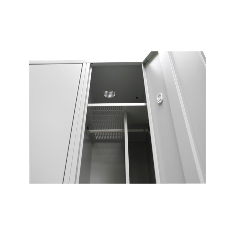 Pour sécher les vêtements de travail. Temps de séchage de vêtements humides estimé en 4-5h. En tôle acier, peinture époxy avec traitement anti-corrosion. Pieds avec vérins de réglage. Tablette soudée, penderie avec cloison de séparation pour vêtements de ville et vêtements de travail. Porte renforcée, fermeture par verrou cadenassable. Aérations. Vestiaires connectables en série. Débit d’air : 150 m³/h Temporisation : 5 h L x H x P : 800 x 1940 x 490 mm Options, version 1000 W et sur socle banc, sur consultation.